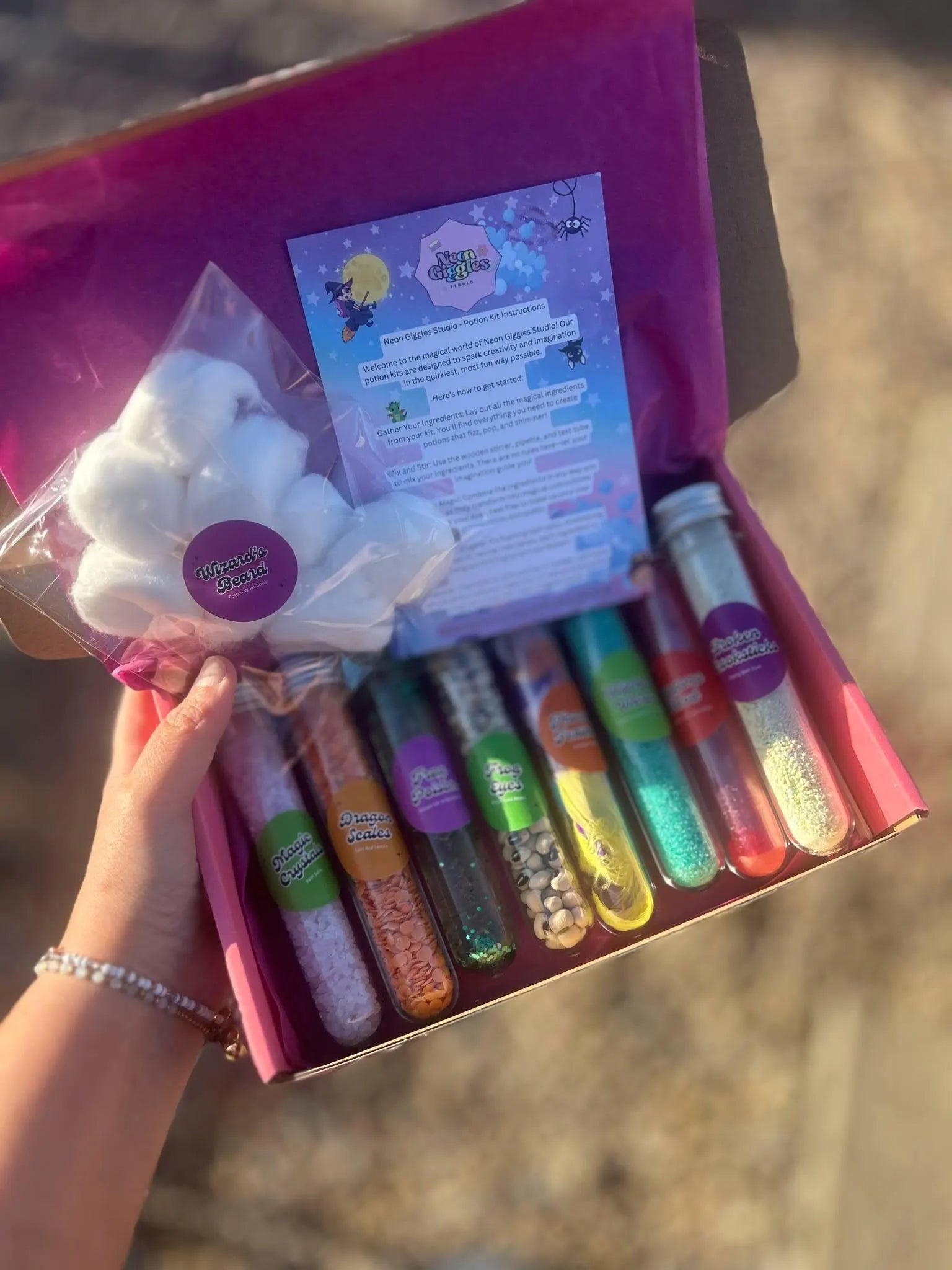 The Cosmic Potion Kit is designed for little dreamers who love the stars, planets, and galaxies beyond. Packed with shimmering ingredients and cosmic textures, this potion kit transforms sensory play into an intergalactic adventure.